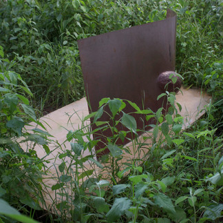 Scout, is a solo exhibition by Marie Lund in the gallery’s second space in Mérida, Yucatán. Scout is a project where the artist has devised a transformation of the sculptural work beyond her control, involving the space, the climate and the duration of five months in the making of the work. In April she arranged a series of copper-sheets on top of concrete casts in the open-air space, and left them to the elements over the rainy season. Over the course of the summer months the local vegetation has been allowed to grow freely, surrounding the sculptures in the space.